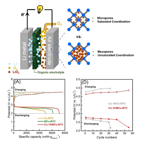 純相金屬-有機骨架(MOFs)具有超高的比表面積和較高活性的金屬中心,在鋰-空氣電池催化領(lǐng)域中有巨大的應用潛力。然而這類(lèi)材料的微孔特性限制了鋰-空氣電池的充放電容量。為解決這一問(wèn)題,銀鳳翔、陳標華課題組開(kāi)發(fā)了一種部分移除配位官能團的方法,在Cu離子與均苯三甲酸配位過(guò)程中引入間苯二甲酸,從而在微孔Cu-MOF中構造了大量的介孔以及具有不飽和配位的Cu金屬中心。通過(guò)實(shí)驗及理論計算研究表明,在電催化過(guò)程中,大量的介孔以及不飽和配位的Cu金屬中心可以有效降低空間位阻從而增強傳質(zhì),降低電子傳導阻力,提高與反應物之間的親和力,同時(shí)為不溶性鋰-空氣電池放電產(chǎn)物Li2O2提供更多的存儲空間。在該介孔Cu-MOF上負載Co后,最為優(yōu)化的催化劑在鋰-空氣電池中可產(chǎn)生近7000mAh/g的放電容量;在1000mAh/g放電容量時(shí),可以穩定充放電循環(huán)55圈,而使用微孔Cu-MOF的催化劑在相同條件下只能穩定32圈。