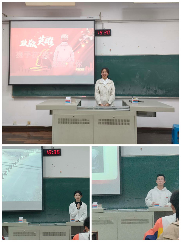 活動(dòng)開(kāi)始,由趙梓岑率先發(fā)言,她先引入了英雄的概念,再由三個(gè)抗疫視頻帶領(lǐng)同學(xué)們走進(jìn)抗疫英雄故事;接著(zhù)石智峰用一張張圖片讓同學(xué)們深入認識了各個(gè)抗疫英雄;最后,王嬌杰從抗疫斗爭、榜樣力量、黨中央的嚴格部署和抗疫精神四個(gè)部分展現了抗疫的艱苦歷程。