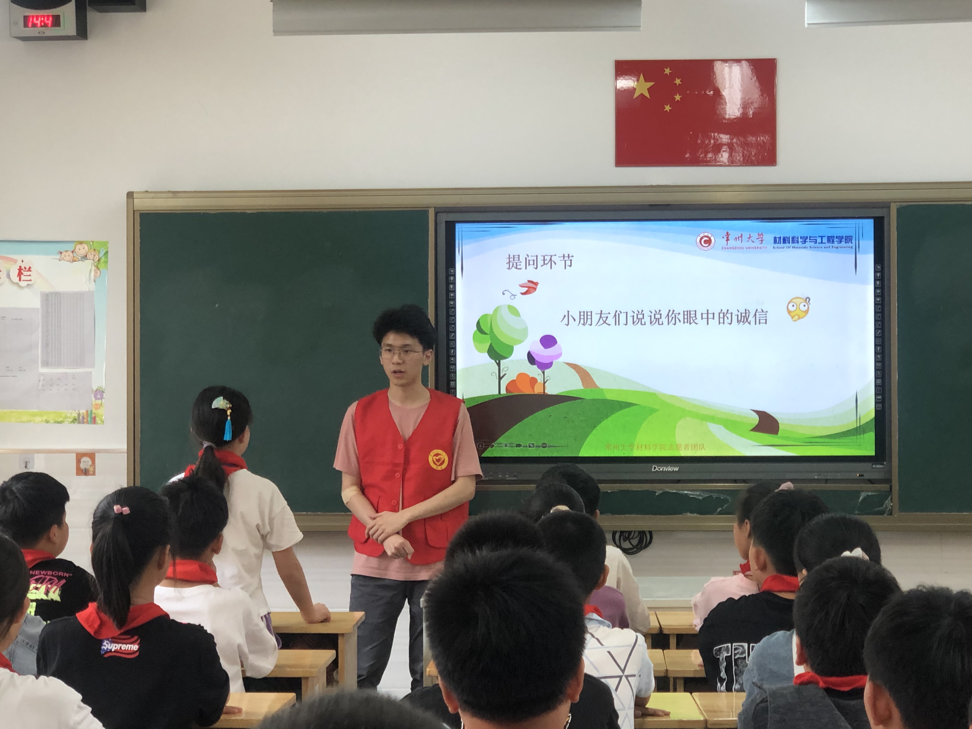 為宣傳紅色黨史、普及誠信教育,6月4日下午兩點(diǎn),常州大學(xué)石油化工學(xué)院食品學(xué)院與材料工程學(xué)院志愿者們?yōu)槿嗣衤沸W(xué)五年級(3)班的同學(xué)們開(kāi)展“銘黨史、講誠信、守初心”志愿宣講活動(dòng),