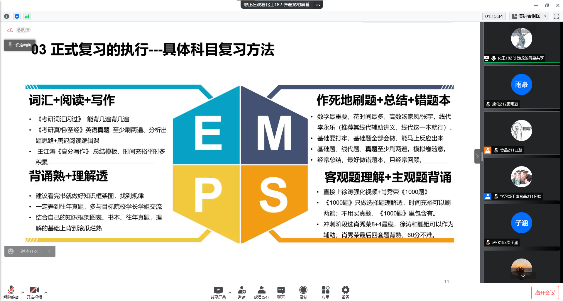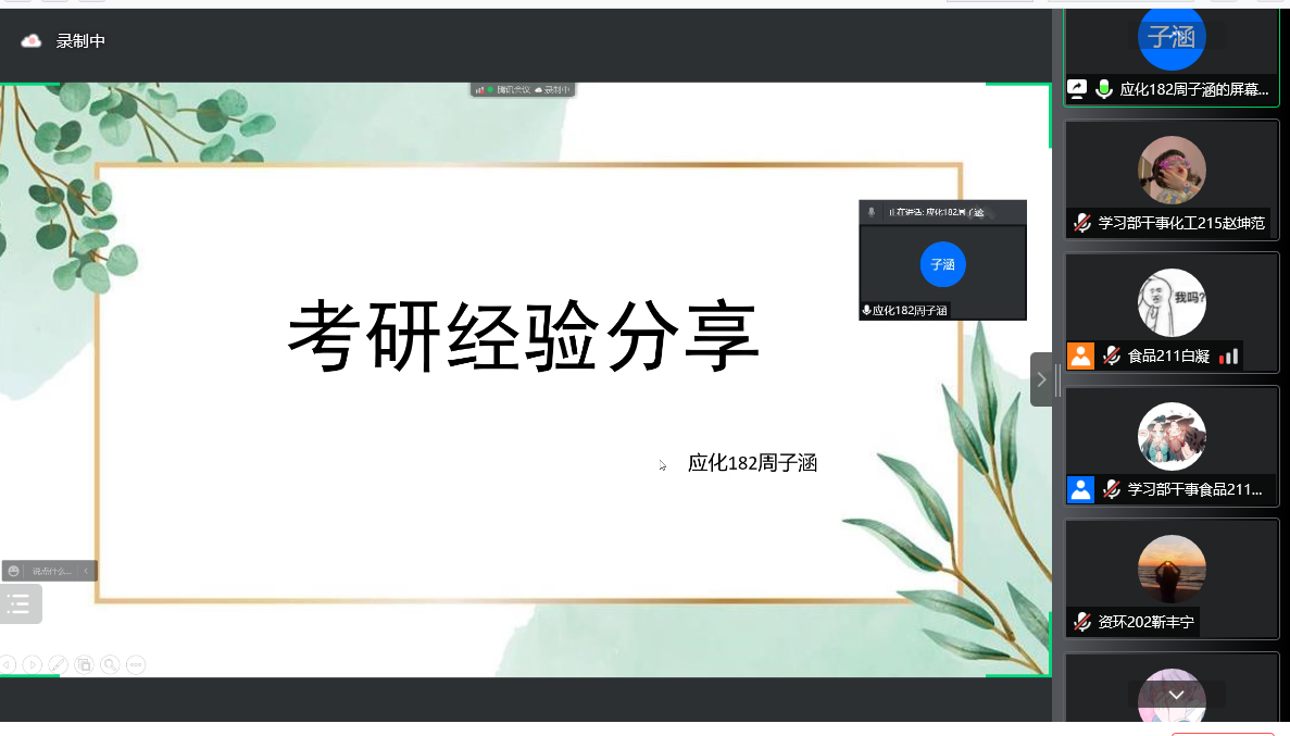 營(yíng)造良好學(xué)風(fēng),鼓勵學(xué)生挖掘自身潛能、把握深造機會(huì ),我院于2022年4月15日、22日、29日在騰訊會(huì )議開(kāi)展三場(chǎng)“研”路有你主題榜樣宣講活動(dòng),本次宣講由成功上岸南京大學(xué)、廈門(mén)大學(xué)、大連理工大學(xué)、中國石油大學(xué)和華東理工大學(xué)等14所高校的學(xué)生主講。