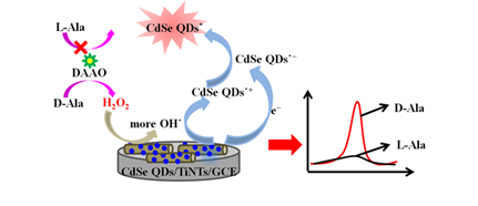 氨基酸(AA)是生物體內最重要的分子之一,絕大多數AA具有對映異構體,不同的AA對映體往往表現出不同的生理特性,一種AA對映體可能對疾病治療有益,而另一種對映體可能毫無(wú)用處甚至具有副作用。因此對AA對映體進(jìn)行手性識別具有重要的研究意義。在本工作中,課題組制備了3-巰基丙酸功能化的硒化鎘量子點(diǎn)(MPA-CdSe QDs),使其與氨基化的TiO2納米管(NH2-TiNTs)發(fā)生酰胺化反應。由于CdSe QDs與TiNTs之間的協(xié)同效應,得到的CdSe QDs/TiNTs獲得了增強的ECL性能。利用D-氨基酸氧化酶(DAAO)可選擇性地催化D-AA產(chǎn)生H2O2,采用電化學(xué)發(fā)光法實(shí)現該傳感體系在存在DAAO的條件下對多種AA對映體的手性識別。結果表明,該手性傳感體系具有較好的對映選擇性、穩定性、重現性和普適性。此外,選取D-丙氨酸(D-Ala)作為檢測對象,該傳感體系對D-Ala具有較好的響應行為,這表明該手性傳感器不僅可用于A(yíng)A對映體的手性識別,還可實(shí)現對D-AA的高靈敏檢測。該成果于近日發(fā)表于分析化學(xué)領(lǐng)域國際著(zhù)名期刊Analytical Chemistry (doi: 10.1021/acs.analchem.2c01383)。