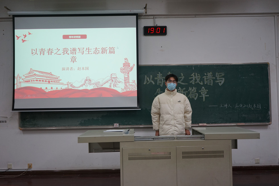 為深入學(xué)習貫徹黨的二十大精神,牢固樹(shù)立和踐行綠水青山就是金山銀山的理念,強化大學(xué)生生態(tài)文明意識,我院于12月5日在W1205舉辦“青年講師團”系列講座——以青春之我譜寫(xiě)生態(tài)新篇章。講座由本科生第一學(xué)生黨支部黨員趙本國主講,各年級學(xué)生代表參加。