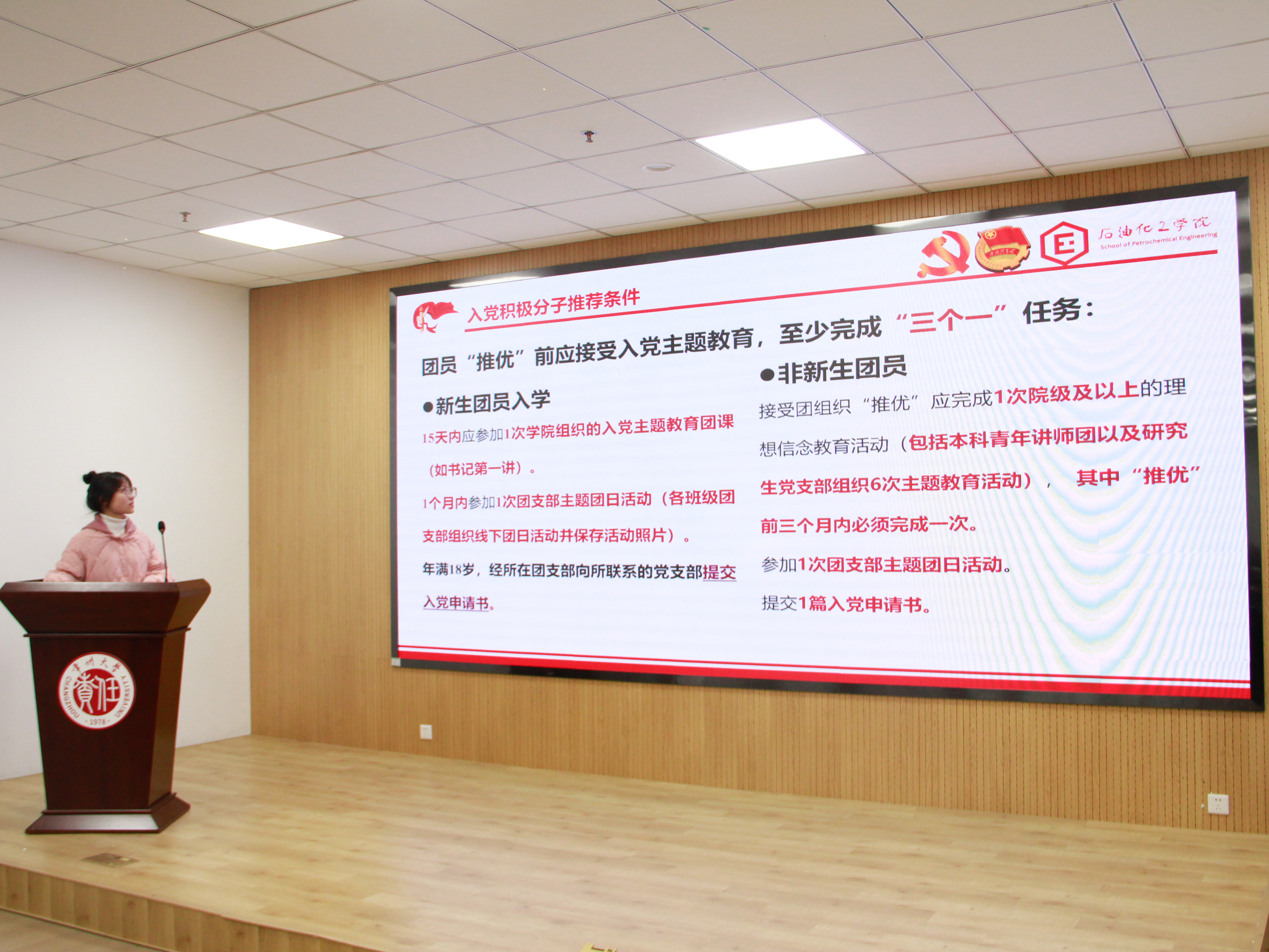 首先,余琳琳概述了常州大學(xué)共青團推優(yōu)入黨工作實(shí)施辦法,并詳細介紹了入黨積極分子和發(fā)展對象的推薦條件及推優(yōu)工作程序。隨后,晏春風(fēng)根據《常州大學(xué)發(fā)展黨員工作實(shí)施細則》向同學(xué)們介紹了黨員發(fā)展流程和入黨材料填寫(xiě)要求。最后,趙彩霞對黨員發(fā)展的時(shí)間線(xiàn)做進(jìn)一步梳理和總結,鼓勵團員們向身邊的黨員看齊,積極發(fā)揮先鋒模范作用。勤奮科研,提高創(chuàng )新能力,力爭將所學(xué)所專(zhuān)與國家需求相結合;甘于奉獻,增強服務(wù)意識,主動(dòng)為周邊老師同學(xué)等提供幫助支持,以實(shí)際行動(dòng)向黨組織靠攏。