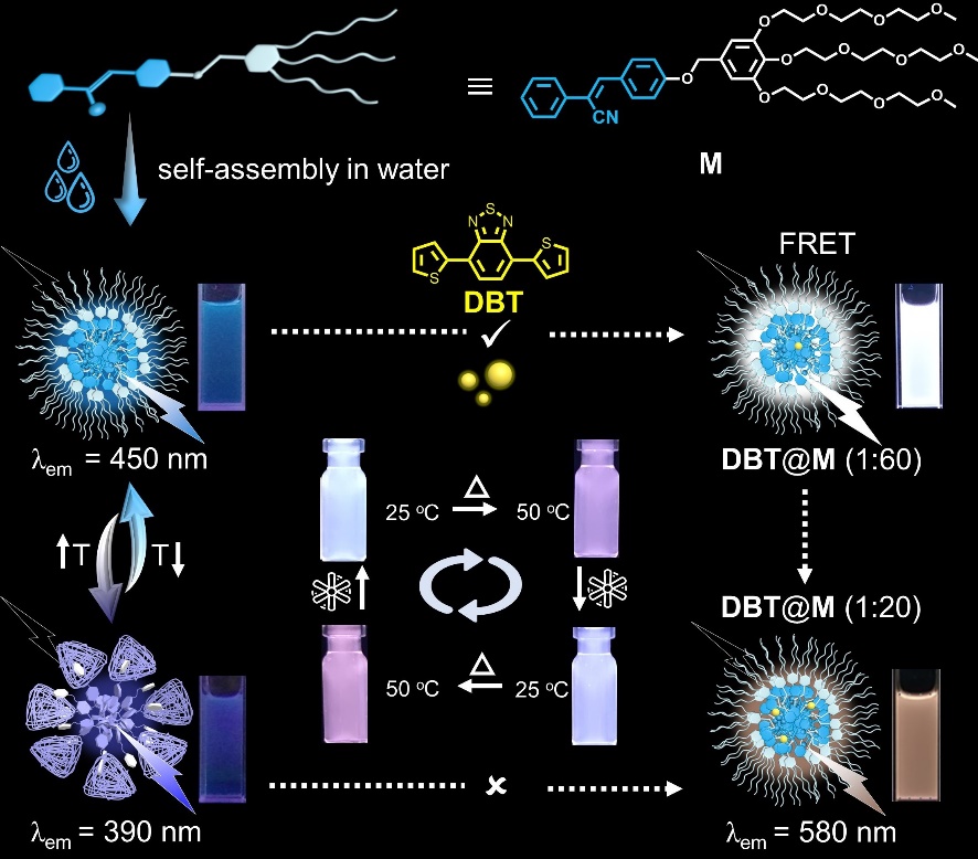 在前期的研究中,課題組開(kāi)發(fā)了若干人工超分子光捕獲系統(J. Mater. Chem. A2022, 10, 8528-8534. Chem. Commun., 2022, 58, 2343-2346.)和溫度響應有機熒光材料(Chem. –Eur. J.2023, 29, e202203463. Chin. Chem. Lett., 2023, 34, 108617.)。在這些工作究的基礎上,同時(shí)基于自然界光合作用受溫度影響的啟發(fā),課題組近期在水相中又構筑了一種具有可調白光發(fā)射的溫度響應型人工光捕獲系統,相關(guān)工作以“A temperature-responsive artificial light-harvesting system in water with tunable white-light emission”為題發(fā)表在國際材料化學(xué)權威雜志Journal of Materials Chemistry A上(J. Mater. Chem. A, 2023, 11, 18419-18425. IF: 11.9)。