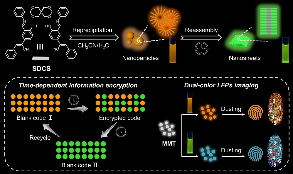 具有隨時(shí)間變化發(fā)光顏色的有機發(fā)光材料在化學(xué)傳感、高分辨率生物成像和高安全性信息加密等領(lǐng)域顯示出廣闊的應用前景?;诖?,研究組開(kāi)發(fā)了一種橋連的氰基苯乙烯衍生物SDCS作為CH3CN/H2O混合溶劑中的單一組分的時(shí)間依賴(lài)熒光系統。具體來(lái)說(shuō),通過(guò)再沉淀法從SDCS制備的原始橙色發(fā)光納米顆??梢栽诔肿幼越M裝的驅動(dòng)下隨著(zhù)時(shí)間的推移轉變?yōu)榫G色發(fā)光納米片。值得注意的是,這種轉化速率可以通過(guò)調整含水量來(lái)控制?;谶@些獨特的屬性,時(shí)變熒光二進(jìn)制碼被開(kāi)發(fā)出來(lái),從而實(shí)現了具有更高安全性的時(shí)間依賴(lài)信息加密。此外,SDCS的雙色發(fā)光可以通過(guò)固體基質(zhì)來(lái)獨立固定,如被固定在水凝膠或粉末中。其中被固定在蒙脫土中所得的發(fā)光粉末成功地用于潛指紋的雙色熒光成像。這項工作展示了利用超分子策略控制單組分系統中的多重發(fā)射性質(zhì)并賦予其多功能應用。相關(guān)工作以“Dynamic Time-Dependent Emission in Solution and Stable Dual Emission in Solid Matrix Exhibited by a Single-Component Fluorescence System”為題發(fā)表在國際材料科學(xué)權威雜志Advanced Functional Materials上(Adv. Funct. Mater.2024, doi: 10.1002/adfm.202314093. IF: 19.0)。