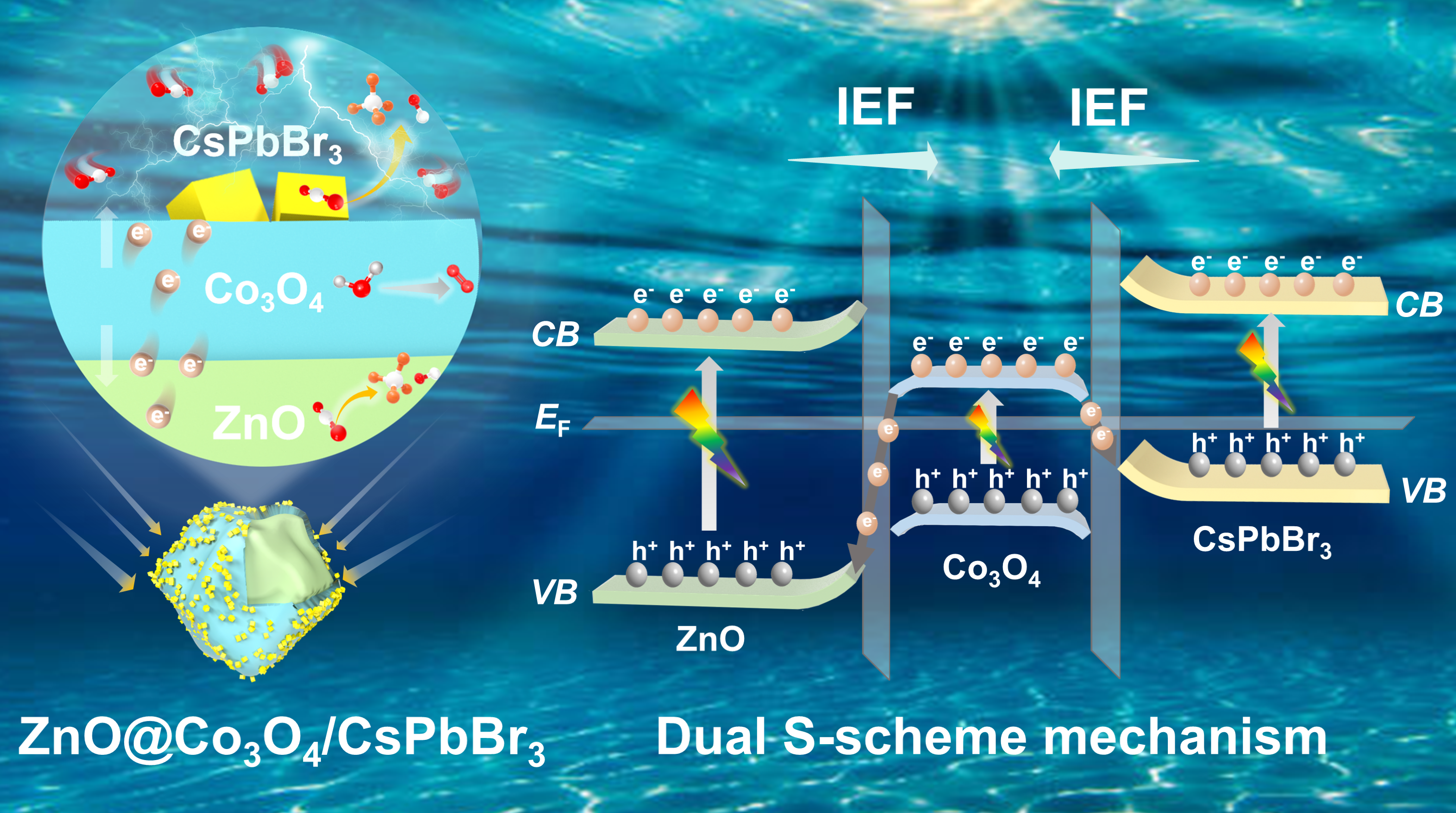 在前期工作基礎上(J. Mater. Chem. A, 2022, 10, 24519-24528;Chem. Eng. J. 2023, 475, 146385),同時(shí)通過(guò)合理設計具有強內建電場(chǎng)和高氧化還原能力的S型異質(zhì)結的啟發(fā),課題組制備MOFs衍生的ZnO@Co3O4/CsPbBr3多殼層催化劑在不使用犧牲劑和光敏劑的情況下,最佳光催化劑CH4產(chǎn)率為238.8 μmol g-1 h-1,選擇性高達90.9%。相關(guān)工作以:“Internal electric field-modulated dual S-scheme ZnO@Co3O4/CsPbBr3 nanocages for highly active and selective photocatalytic CO2 reduction”為題發(fā)表在Journal of Catalysis上 (J. Catal. 2024, 435, 115574, doi:10.1016/j.jcat.2024.115574)