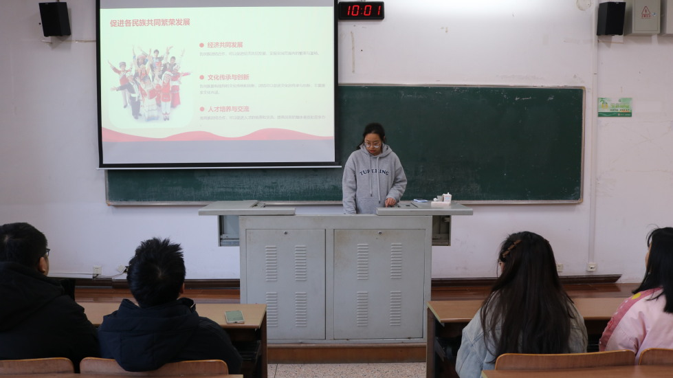 為了促進(jìn)各民族的團結友愛(ài)、構建和諧美好的民族大家庭,我院于12月29日在W1202教室開(kāi)展了主題為“民族團結一家親,同心共筑中國夢(mèng)”的宣講活動(dòng)。宣講會(huì )上,謝露深入淺出地圍繞民族團結的關(guān)鍵意義、中國夢(mèng)的豐富內涵與意義、民族團結與中國夢(mèng)之間的緊密聯(lián)系以及青少年踐行方式四個(gè)核心維度,帶領(lǐng)大家深入解讀中國夢(mèng)和民族團結的關(guān)系。朱一飛與各位同學(xué)交流了各民族風(fēng)俗,宣傳了宗教與教育相分離原則。通過(guò)本次宣講活動(dòng),同學(xué)們對民族團結和中國夢(mèng)有了更深的理解和感悟,同時(shí)也激發(fā)了他們的責任感與使命感。