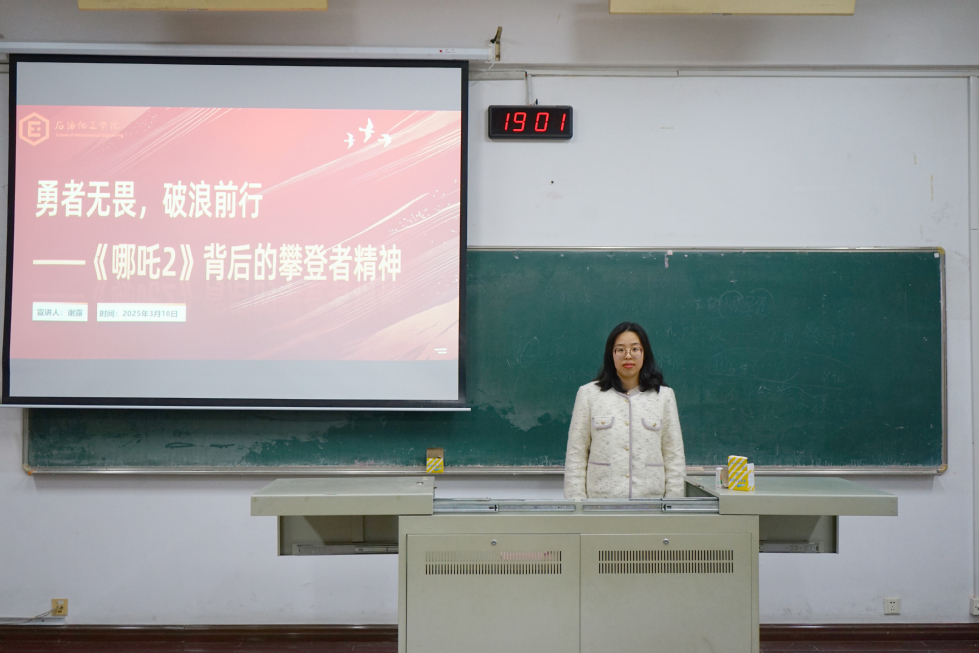 講座上,楊帆以《哪吒2》突破百億票房為切入角,指出《哪吒2》的大火啟示我們應積極培養創(chuàng )新意識,勇于實(shí)踐,將創(chuàng )新精神融入學(xué)習和生活的方方面面,為個(gè)人和社會(huì )創(chuàng )造更大的價(jià)值。接著(zhù)謝露向同學(xué)們引出《哪吒2》背后的攀登者精神——刻苦鉆研、技術(shù)革新、團隊精神以及文化傳承。她指出作為大學(xué)生要堅守信念,培養鉆研探索的精神。