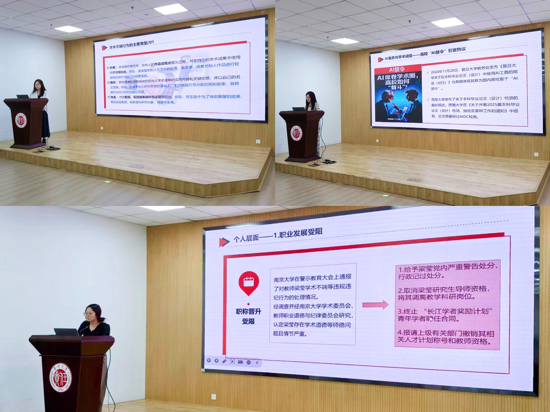 活動(dòng)中,李欣庭根據《高等學(xué)校預防與處理學(xué)術(shù)不端行為辦法》,介紹了抄襲、數據造假、文獻篡改等七種類(lèi)型的學(xué)術(shù)不端行為及其界定標準;韓明楊結合近年來(lái)通報的學(xué)術(shù)不端典型案例,揭示學(xué)術(shù)不端對個(gè)人、學(xué)術(shù)共同體及社會(huì )信任的嚴重危害;唐一航聚焦AI技術(shù)浪潮,深入探討其應用帶來(lái)的學(xué)術(shù)誠信新挑戰,并分享數字化時(shí)代堅守學(xué)術(shù)底線(xiàn)的實(shí)踐路徑。