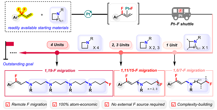 近期,常州大學(xué)陳銘教授團隊發(fā)展了一種全新的鉑催化策略,利用簡(jiǎn)單易得的偕二氟亞甲基烯烴作為含氟前體,通過(guò)模塊化的多單元插入反應,首次實(shí)現了超遠程氟遷移,成功構建出一系列1,6-、1,7-、1,11-、1,15-乃至1,19-二氟化合物。這項研究將氟原子的遷移距離前所未有地拓展至19個(gè)化學(xué)鍵,開(kāi)辟了C–F鍵重構與空間編輯的新路徑。