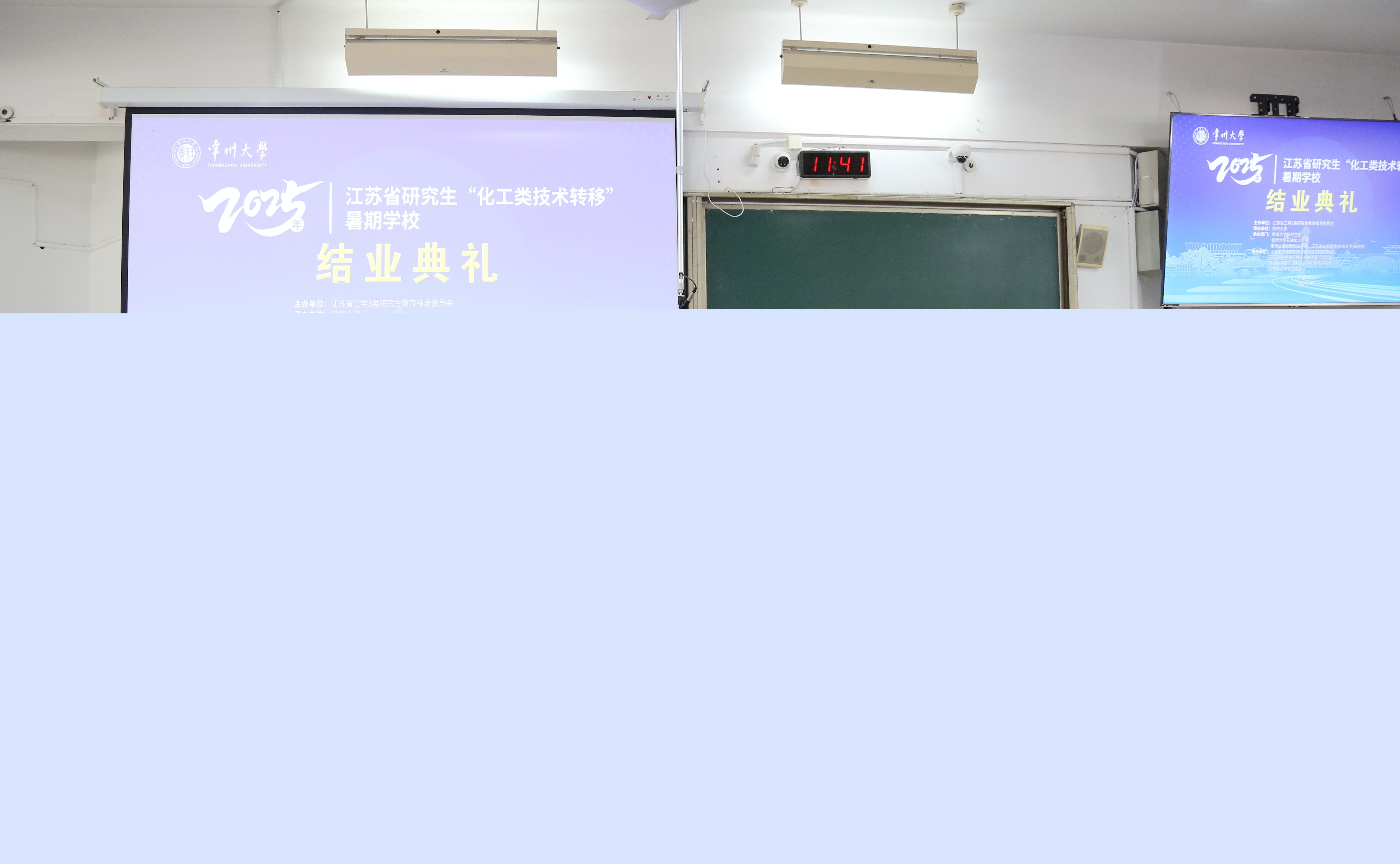 2025年8月29日上午,江蘇省研究生“化工類(lèi)技術(shù)轉移”暑期學(xué)校圓滿(mǎn)落下帷幕,我院副院長(cháng)劉英杰、江蘇省技術(shù)轉移(常州大學(xué))研究院副院長(cháng)姚娟和全體學(xué)員出席了結業(yè)典禮。本次暑期學(xué)校歷時(shí)6天,吸引了來(lái)自省內外十余所高校的百余名優(yōu)秀研究生及教師參與。