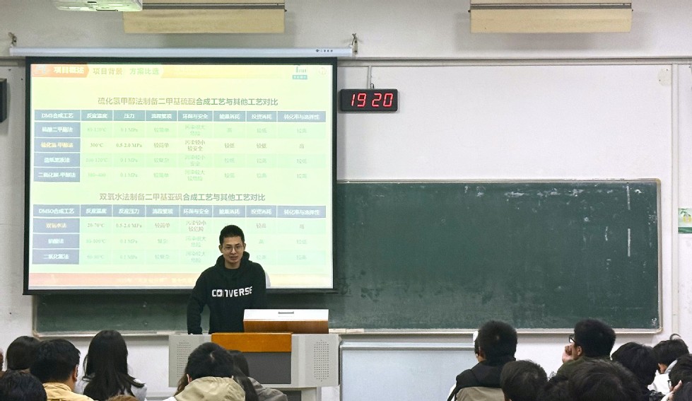 為幫助同學(xué)們拓寬專(zhuān)業(yè)視野、提升專(zhuān)業(yè)實(shí)踐能力,11月11日晚,“石化青年說(shuō)”系列講座第二講在W1207教室順利舉行,講座由化工224班常佩源與化工226班張皓博兩位同學(xué)擔任主講。他們所在的常州大學(xué)“砜硫隊”,曾憑借“福建凱美特氣體有限公司分公司年產(chǎn)1.5萬(wàn)噸二甲基亞砜項目”的出色設計,在2025年“天正設計杯”第十九屆全國大學(xué)生化工設計競賽中脫穎而出,斬獲全國特等獎。