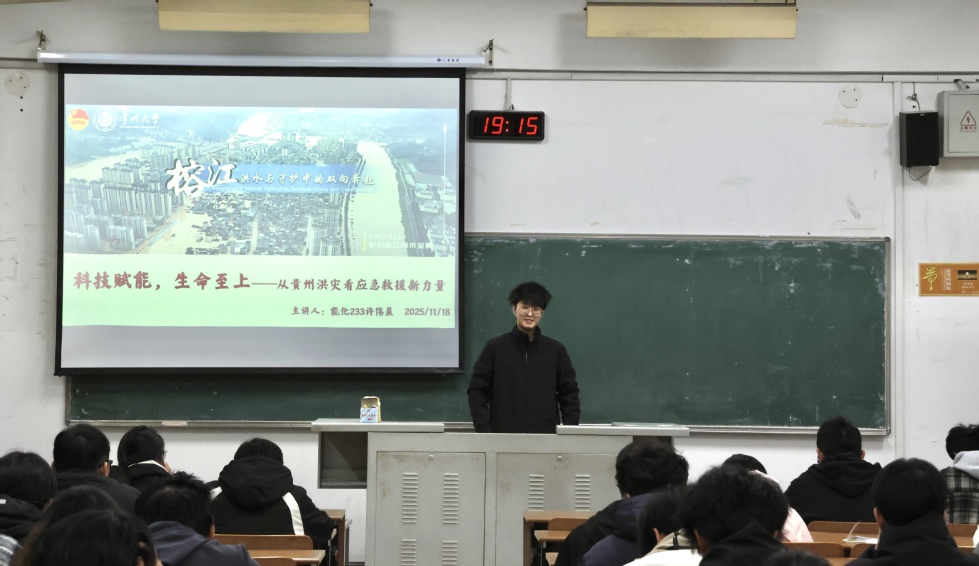 為幫助同學(xué)們更直觀(guān)地了解科技如何重塑應急救援體系、守護生命安全,11月18日晚,學(xué)生第二黨支部黨員能化233班許偉晨在W1205教室開(kāi)展了“青年講師團”系列講座的第三講——“貴州洪災,見(jiàn)證科技力量”。