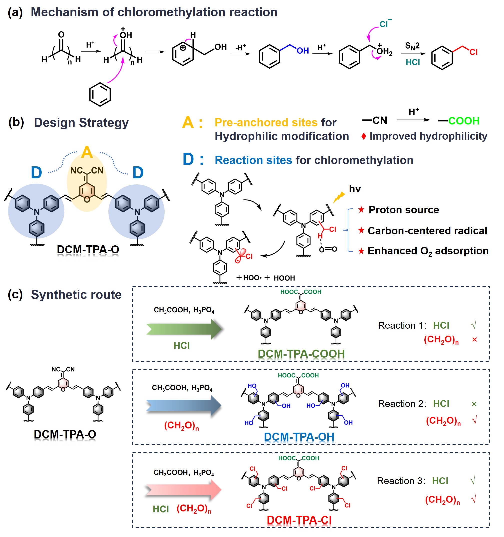 (1)針對氧氣吸附能力不足的問(wèn)題,在CMPs材料中通過(guò)后修飾反應引入吸電子基團是解決此問(wèn)題的好方法(圖1)。在之前的工作中引入磺酸基和季銨鹽(Adv. Funct. Mater.2025, 35, 2415244)的基礎上,我們首次將氯甲基引入CMPs中用于高效生產(chǎn)H2O2。在聚合物催化劑的制備中,氯甲基修飾的聚合物常用作傅-克烷基化等交聯(lián)反應的中間體,因其疏水性而未在光催化產(chǎn)H2O2領(lǐng)域引起重視。經(jīng)典的Blanc氯甲基化反應常用聚甲醛和鹽酸為氯甲基化試劑,磷酸或冰醋酸等為縮合劑?;诖?,我們在材料設計中以三苯胺為反應位點(diǎn),以氰根為酸化位點(diǎn),通過(guò)一步氯甲基化反應,同時(shí)引入氯甲基和羧基,分別用于增強氧氣吸附和改善親水性。經(jīng)氯甲基修飾的CMPs在純水和空氣中的產(chǎn)H2O2速率達到5.0 mmol g-1 h-1,在氧氣氛圍中的性能僅增長(cháng)1.8%,證明其氧氣吸附能力之強。而在苯甲醇和水的混合溶劑中性能更是達到了38.0 mmol g-1 h-1,超過(guò)大多數目前已報到的催化劑。該工作以Chloromethylation modified pyranonitrile-based conjugated microporous polymers for selective one-step two-electron O2 reduction to H2O2為題,發(fā)表在化學(xué)領(lǐng)域頂級期刊Angew. Chem. Int. Ed.2025, 64, e202508436。