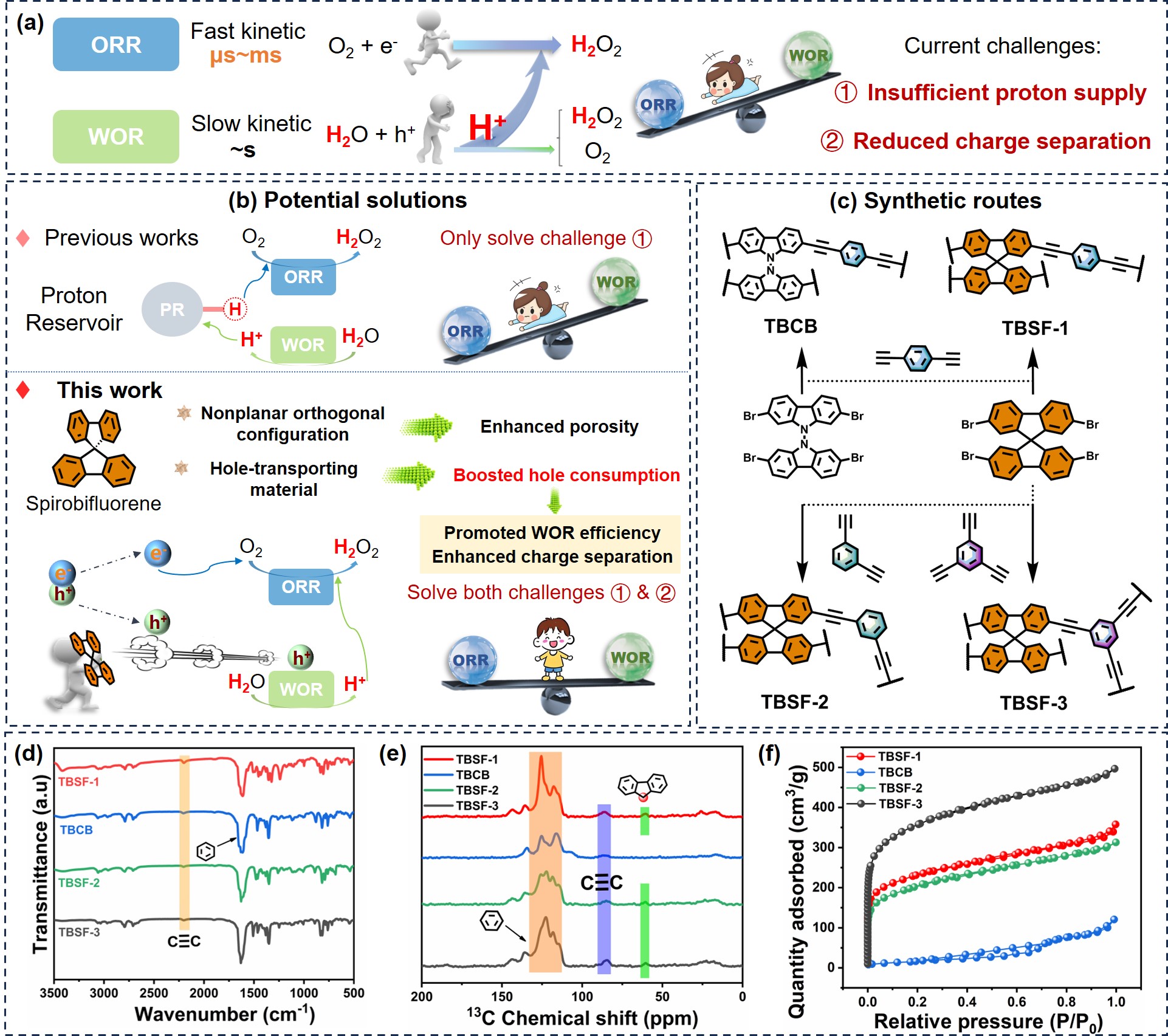 (2)針對質(zhì)子供應有限的問(wèn)題,我們在之前的工作中(Chem, Sci.2025, 16, 8577-8587)提出“質(zhì)子海綿”的概念,直接給氧還原反應(ORR)供質(zhì)子,來(lái)解決“質(zhì)子悖論”問(wèn)題。但該策略并未有效抑制光生載流子的復合和提高電荷傳輸能力。為此,我們提出直接提高水氧化反應(WOR)性能的策略,以螺二芴分子為構筑單元合成COPs催化劑(圖2)。螺二芴具有正交的空間構型,是高效的空穴傳輸材料,基于其的COPs具有諸多優(yōu)點(diǎn),例如WOR性能大幅度提高以產(chǎn)生更多質(zhì)子,滿(mǎn)足ORR較快的動(dòng)力學(xué)需求;加速空穴消耗,抑制載流子復合;獨特的正交電荷傳輸通道更是加速了電荷的傳輸。因此,這類(lèi)COPs催化劑在純水和空氣中的產(chǎn)H2O2速率達到9.29 mmol g-1 h-1,在氮氣氛圍中也能達到3.28 mmol g-1 h-1。該工作以Orthogonal Configurative Spirobifluorene-Based Conjugated Organic Polymers for Enhanced Water Oxidation Reaction to Boost H2O2 Photosynthesis為題,發(fā)表在材料學(xué)領(lǐng)域頂級期刊Adv. Funct. Mater.2025, e18050。
