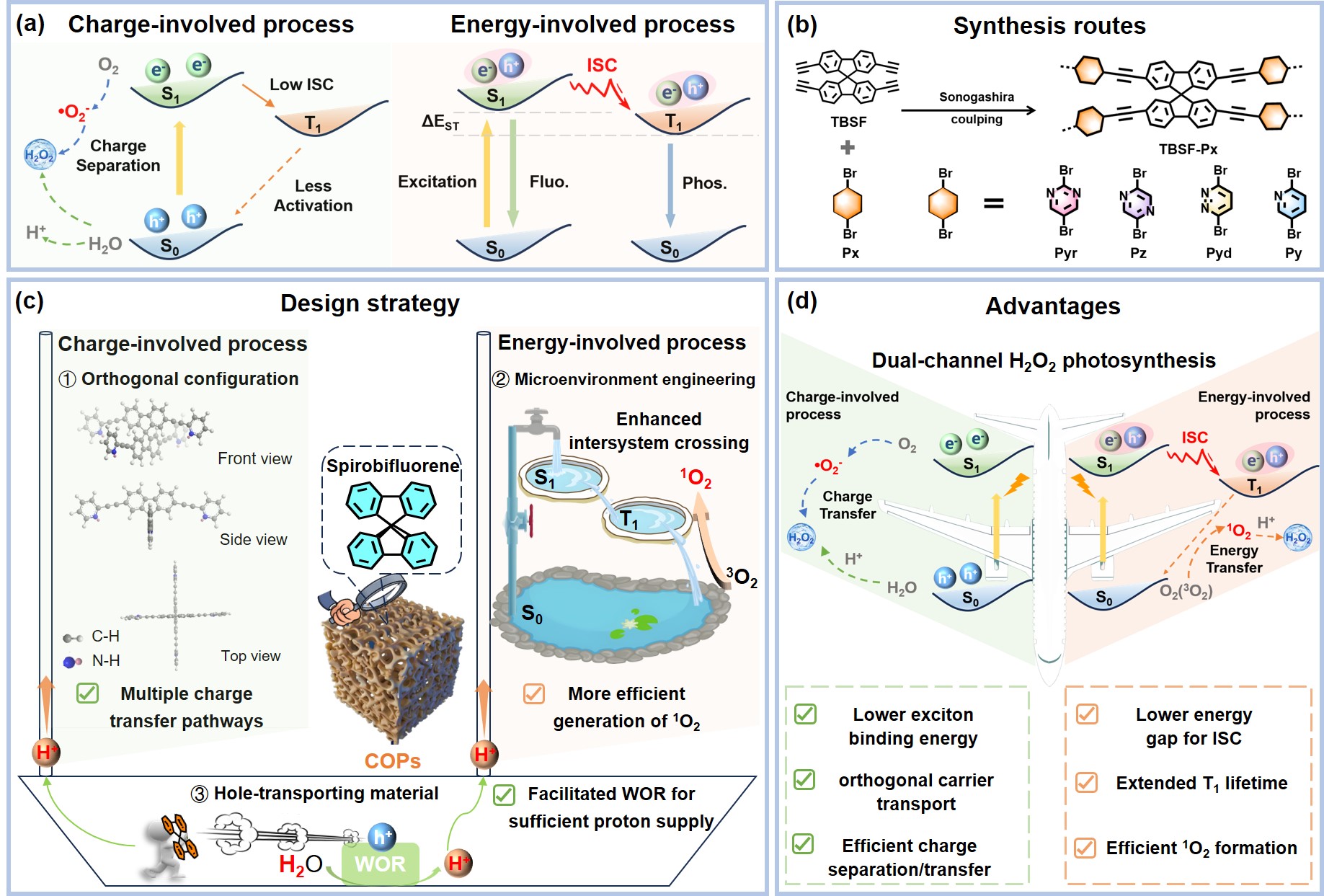 (3)針對能量路徑較弱的問(wèn)題,我們探索了將傳統的電荷路徑與能量路徑耦合的策略。能量路徑是指以單線(xiàn)態(tài)氧(1O2)為關(guān)鍵中間體生產(chǎn)H2O2,1O2主要由三線(xiàn)態(tài)氧(3O2)產(chǎn)生,此過(guò)程涉及從三重激發(fā)態(tài)(T1)回到基態(tài)(S0)的能量轉移。目前大多數催化劑的T1壽命較短,難以穩定存在,這是能量路徑研究較少的主要原因。為此,我們繼續以螺二芴為結構單元,通過(guò)交聯(lián)劑的微環(huán)境調控制備一系列COPs催化劑,提高其電荷和能量雙路徑的性能(圖3)。其優(yōu)點(diǎn)包括:在電荷路徑,降低了激子結合能,提高電荷分離效率,通過(guò)正交通道增強電荷傳輸;在能量路徑,降低了從單重激發(fā)態(tài)(S1)到T1的能壘,加速系間竄躍,延長(cháng)T1壽命,從而提高生產(chǎn)1O2的效率。優(yōu)化后的COPs催化劑在在純水和空氣中的產(chǎn)H2O2速率達到7.21 mmol g-1 h-1,太陽(yáng)能-化學(xué)能轉化效率更是高達1.88%。該類(lèi)催化劑在三相漂浮體系、太陽(yáng)光照實(shí)驗、連續流實(shí)驗和滅菌實(shí)驗中均取得了較好的性能。該工作以Achieve a simultaneous charge- and energy-involved dual-channel mechanism in spirobifluorene-based conjugated organic polymers for enhanced H2O2 photosynthesis為題發(fā)表在化學(xué)領(lǐng)域頂級期刊J. Am. Chem. Soc.2025, DOI: 10.1021/jacs.5c16544.