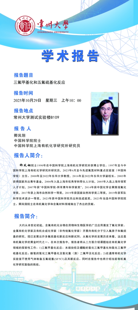 【學(xué)術(shù)報告】10月29日自然與合成有機化學(xué)研究院學(xué)術(shù)報告——卿鳳翎院士 中國科學(xué)院