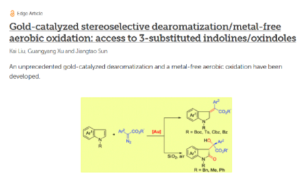近日,石油化工學(xué)院孫江濤教授課題組在化學(xué)頂級期刊《Chemical Science》上發(fā)表題為“Gold-catalyzed stereoselective dearomatization/metal-free aerobic oxidation: access to 3-substituted indolines/oxindoles”的通訊文章,這是我校在此期刊上發(fā)表的第一篇通訊論文。Chemical Science是英國皇家化學(xué)會(huì )(the Royal Society of Chemistry)的旗艦期刊,報道化學(xué)學(xué)科原創(chuàng )性研究成果,是化學(xué)綜合領(lǐng)域最有影響力的三大期刊之一,也是國際上衡量科研小組研究水平的重要標志性期刊。