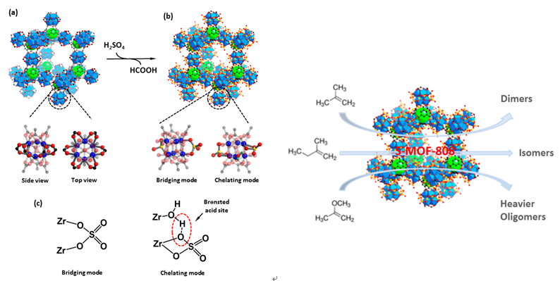 近日,我室劉平副教授在化學(xué)與材料國際頂級刊物Journal of the American Chemical Society(JACS)上發(fā)表全文研究論文。該工作首次系統地報道了低溫常壓下輕質(zhì)烯烴在具有超強Br?nsted酸位的MOF-808上的低聚反應。揭示了MOF-808上單一烯烴低聚及不同烯烴交叉耦聯(lián)的反應機理。同時(shí)對催化劑的失活及再生進(jìn)行了詳細研究,進(jìn)一步證實(shí)了硫酸處理的MOF-808的超強酸位來(lái)源于吸附的水分子與螯合在單個(gè)Zr原子上的硫酸基團形成的氫鍵。因高溫脫水失活的催化劑經(jīng)簡(jiǎn)單的水蒸氣處理即可完全再生。該工作為改進(jìn)商業(yè)催化劑(分子篩受限的酸強度及樹(shù)脂非均一的孔道結構)提供新思路,并為新型MOF材料在石油化工行業(yè)的應用提供新途徑。 Journal of the American Chemical Society是國際化學(xué)與材料領(lǐng)域的頂級期刊,由美國化學(xué)會(huì )創(chuàng )辦于1879年,目前的影響因子為14.695。