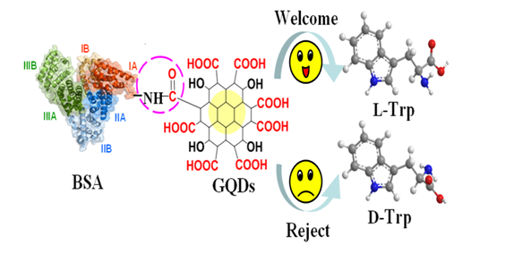 | Covalent Functionalization of Bovine Serum Albumin with Graphene Quantum Dots for Stereospecific Molecular RecognitionQiumin Ye, Lili Guo, Datong Wu, Baozhu Yang, Yongxin Tao, Linhong Deng, Yong Kong* 原文鏈接:https://pubs.acs.org/doi/10.1021/acs.analchem.9b02605 牛血清白蛋白(BSA)是一種研究廣泛的血清蛋白,因其具有易溶、成本低、生物相容性高等優(yōu)點(diǎn)已引起研究者的廣泛關(guān)注。近日,課題組制備了BSA 與石墨烯量子點(diǎn)(GQDs)的復合材料,并將其成功應用于色氨酸(Trp)對映體的電化學(xué)識別。GQDs與BSA之間的酰胺化反應形成的酰胺鍵破壞了BSA原有的規整形貌,改變了BSA整體肽鏈的空間構型,使BSA分子原本的三維心形結構得以擴展,從而使肽鏈上的手性中心更易于暴露,提高了BSA-GQDs復合物的識別效率。