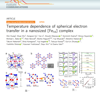 | 近日,我校石油化工學(xué)院吳大雨教授團隊在合成和表征新型無(wú)機納米團簇及其電子行為研究方面取得重要進(jìn)展,在Nature Communications(自然通訊)發(fā)表了題為“Temperature dependence of spherical electron transfer in a nanosized [Fe14] complex”(DOI: 10.1038/s41467-019-13279-y)的原創(chuàng )性論文(文章鏈接:https://www.nature.com/articles/s41467-019-13279-y)。Nature Communications期刊是Nature出版集團旗下的國際頂級綜合性學(xué)術(shù)期刊,該項成果以常州大學(xué)為第一署名單位。近年來(lái),吳大雨教授課題組致力于分子基材料跨學(xué)科研究,所涉及的學(xué)科方向包括化學(xué)、材料學(xué)、物理學(xué)與光電子等。該項工作應用金屬-有機自組裝策略,合成了高核鐵原子納米團簇,通過(guò)精準調控團簇表面的自由電子觀(guān)察分子水平上多電子轉移,顯示出分子基材料在電子轉移活性催化材料、單分子磁體、高密度信息存儲等領(lǐng)域的巨大應用潛力。其亮點(diǎn)不僅在于成功合成氰橋高核鐵納米團簇,同時(shí)結合多種表征方法和理論計算清晰表征團簇球殼表面的電子轉移活性位點(diǎn),其作為電子化合物屬性是一類(lèi)具有特殊性能的量子材料,其中過(guò)剩電子被限域在團簇殼層表面并充當陰離子,對電子傳輸和材料的催化、電磁等性能起關(guān)鍵作用。